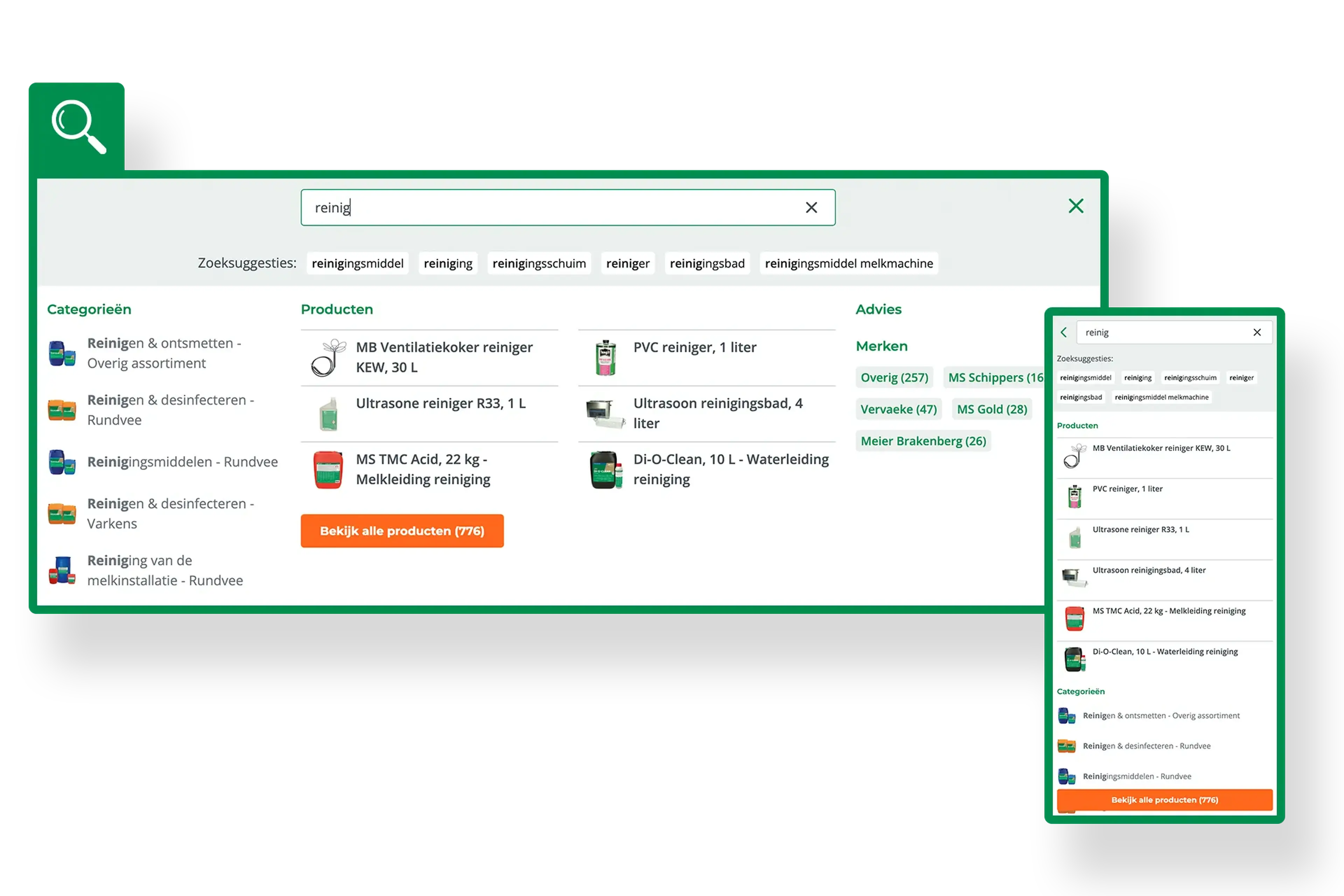 Onze zoekfunctie is sneller, slimmer en relevanter dan ooit. Typ je zoekopdracht en krijg direct gepersonaliseerde resultaten. Je vindt niet alleen snel de juiste producten, maar je kunt ook advies en oplossingen zoeken voor veelvoorkomende uitdagingen en problemen in de stal. Zo krijg je direct de juiste hulp en tips, waardoor je ervaring sneller, makkelijker en helemaal op jou afgestemd is.